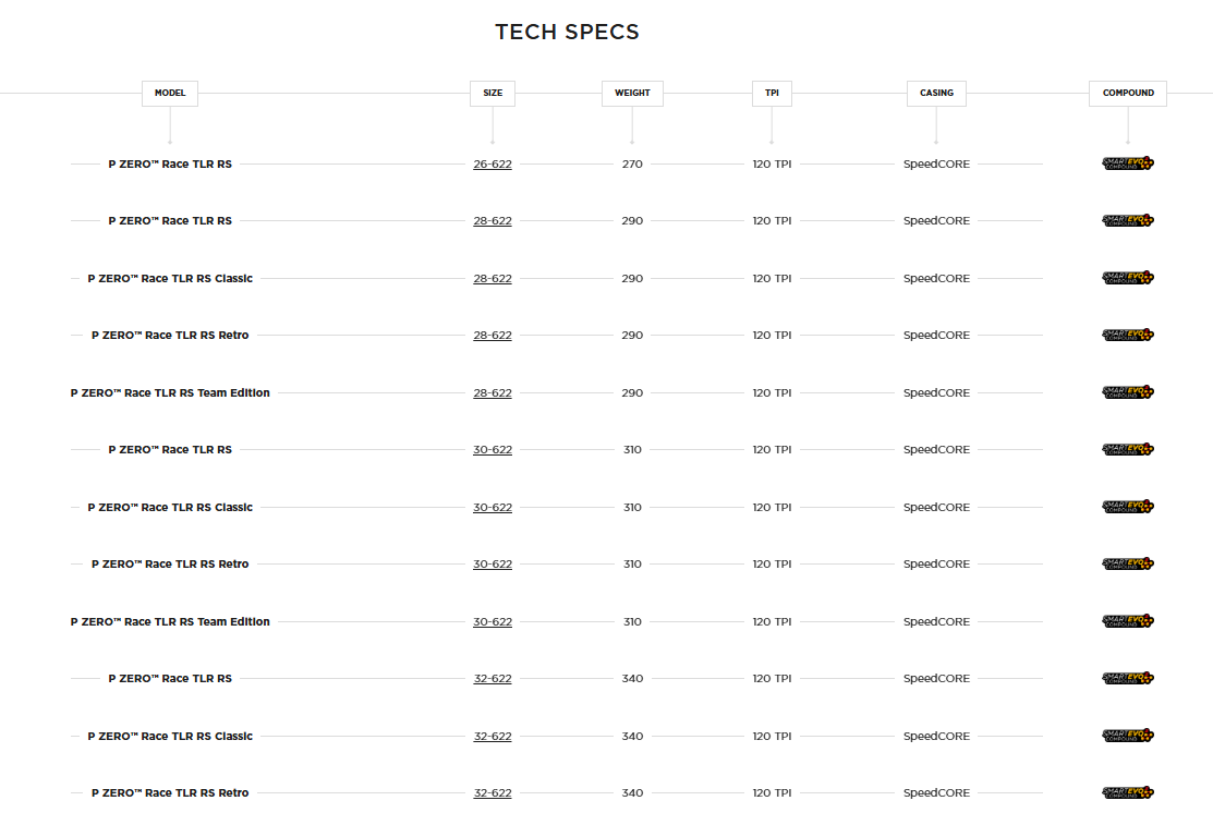 P ZERO™ Race TLR RS представлява най-новото допълнение към гамата от пътни състезателни гуми Pirelli P ZERO™ Race, произведени в Италия. Това постижение е възможно благодарение на новата смес SmartEVO², формулирана с ноу-хау и най-новите материали, използвани в моторните спортове, осигурявайки допълнително подобрение на сцеплението и управлението както на сухи, така и на мокри повърхности. Освен това e олекотена и  патентована структурата SpeedCORE™, включваща тънък, херметичен слой от каучукова смес, обогатена с арамидни частици. Комбинацията от тези фактори направи възможно създаването на гума с висока производителност, която е дори по-бърза за конкурентите, но също и за тези, които искат да се възползват от същата технология като професионалистите.