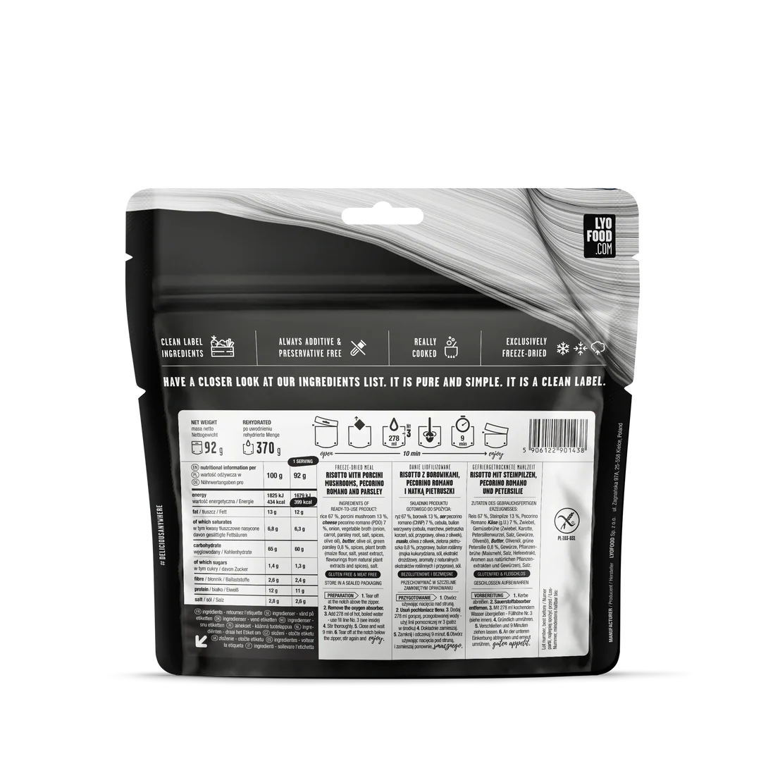 Porcini Risotto / Ризото с манатарки е лиофилизирано основно ястие от марката Lyofood, създадено за бързо и удобно приготвяне у дома, по време на пътуване, къмпинг или outdoor активности. Продуктът е без глутен, подходящ за вегетарианци, с нетно тегло 92 g, 399 kcal на порция, 370 g готово ястие след приготвяне и срок на годност 5 години.