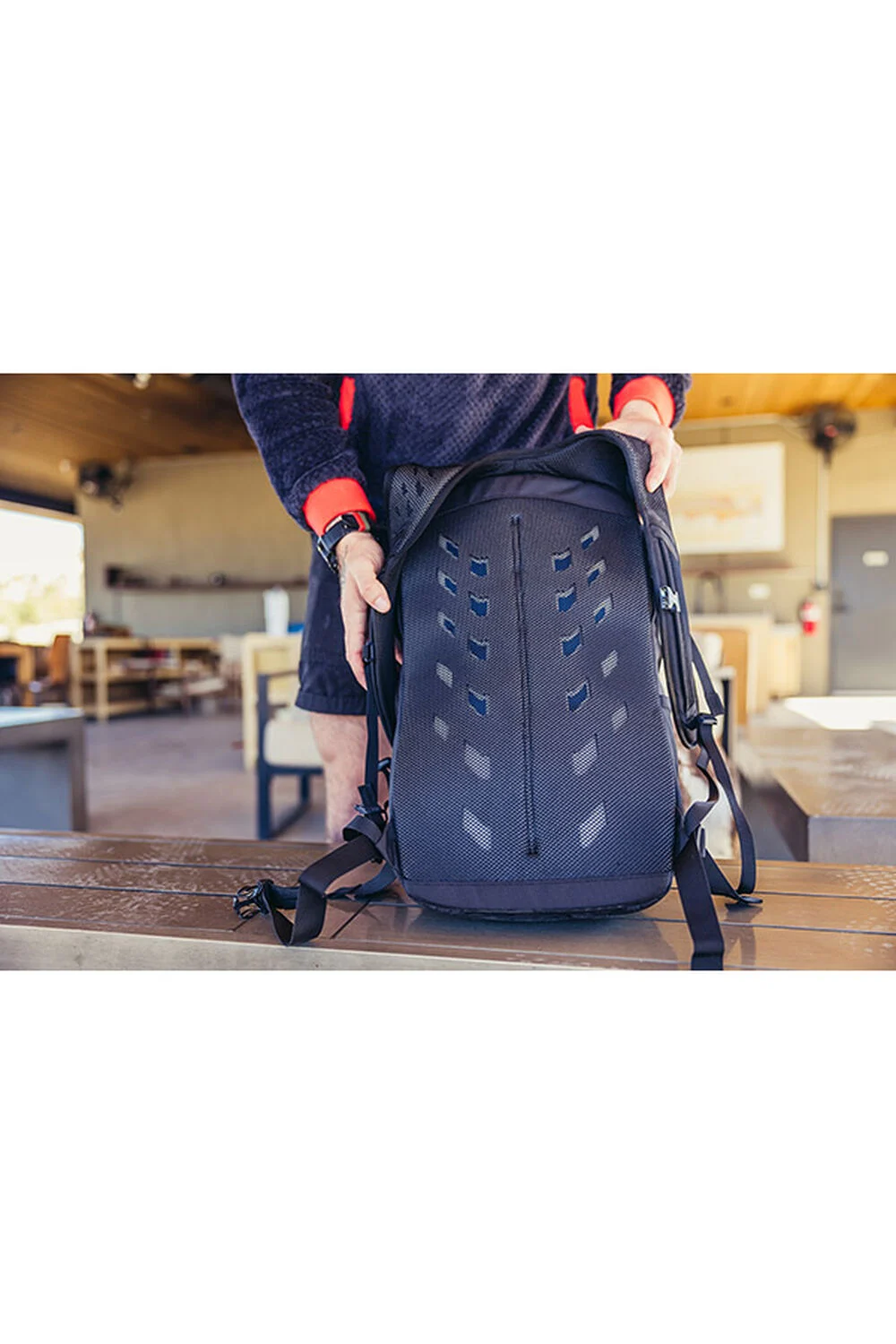• Дишащ заден панел с лазерно изрязани отвори и подвижен 25 мм колан от лента